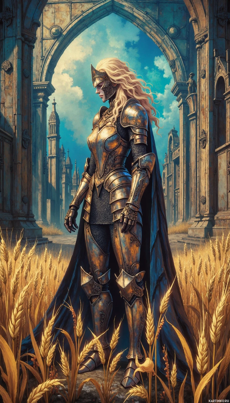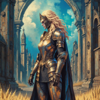 blonde hair and is wearing armor that suggests she might be from a historical or fantasy setting. The background features an archway and what appears to be an old, possibly religious structure, hinting at