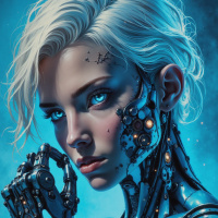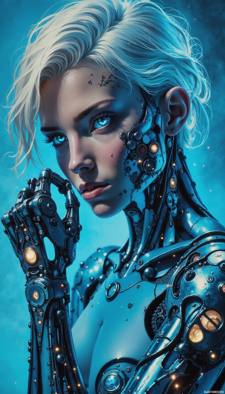 На картинке изображена женщина с белыми волосами в футуристических роботизированных доспехах. На её лице выражение задумчивости или грусти, она смотрит в сторону. Кожа гладкая и безупречная, контрастируя со сложной деталировкой её механических элементов. Фон – холодный синий градиент, возможно, намекающий на космическое или подводное пространство. В целом, картинка создает впечатление передовых технологий и научно-фантастической тематики.