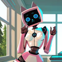 a humanoid robot depicted with human-like features. The robot has cat ears and blue eyes, giving it a cute appearance that contrasts with the typical industrial design of robots in