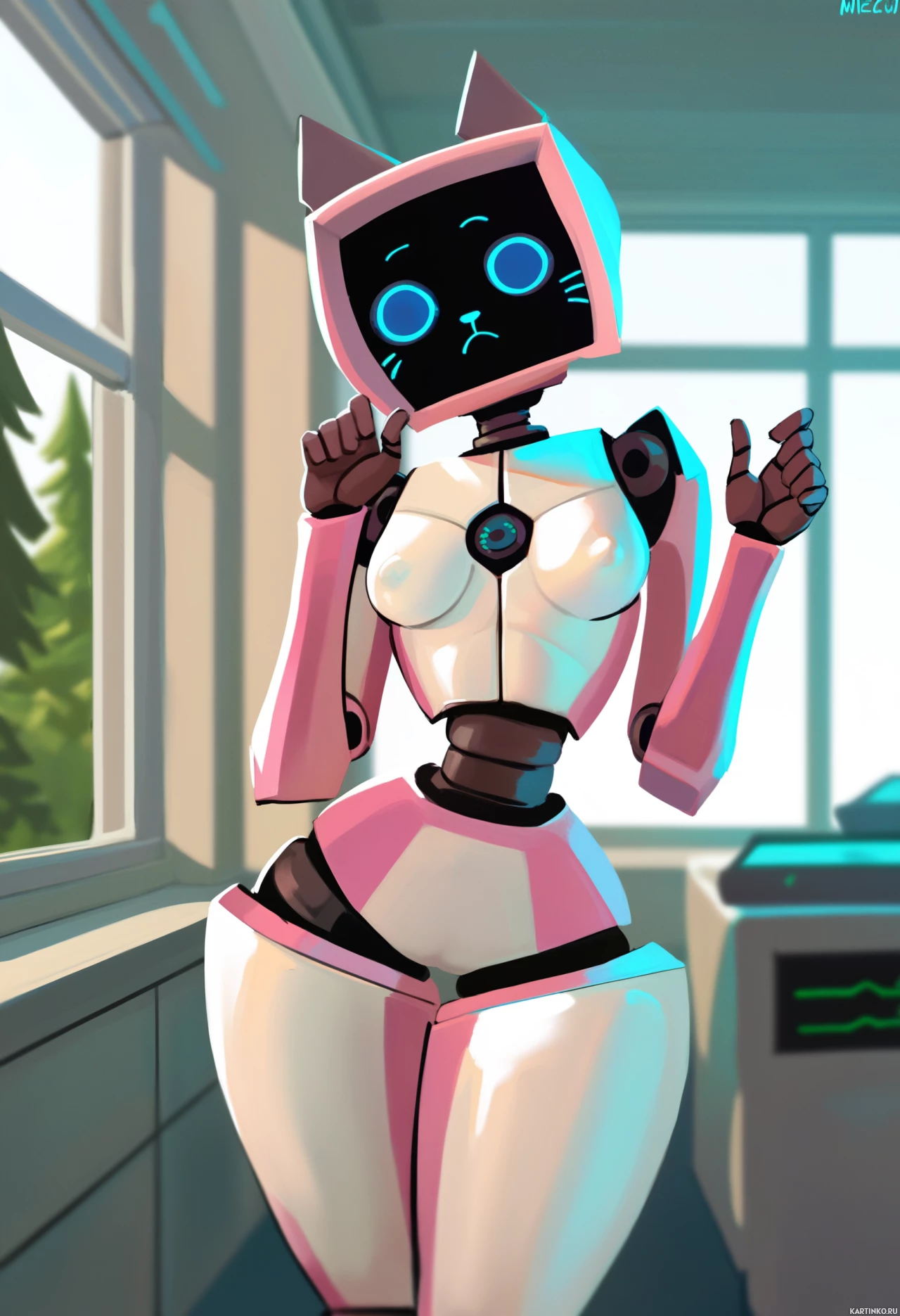 a pink bodysuit with metal or mechanical details. Behind the robot is an open window showing a serene