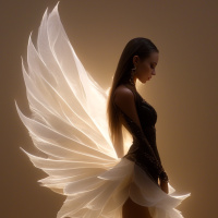 white feather-like elements, giving it a fluffy and ethereal look. The individual's hair style is long and straight, flowing down the back of their head. They have closed eyes and are looking slightly downward. The person exudes