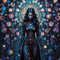 the night sky-like color palette of the background, giving her an ethereal and serene appearance. The lighting highlights the woman's face, neck, and shoulders, creating