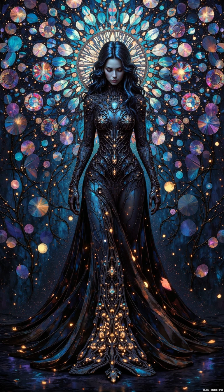 a brunette woman standing against a backdrop that appears to be an intricate celestial or cosmic design, with elements resembling stars and other mystical motifs. She is dressed in a long, flowing dress that seems to blend into
