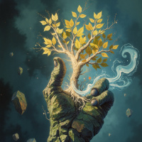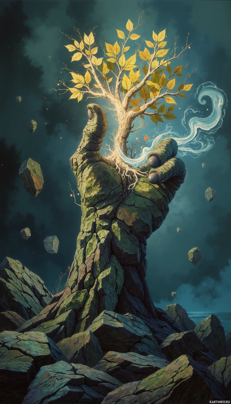 the impression of energy or movement, possibly indicating a magical or otherworldly phenomenon. - At the bottom right corner of the image, there is a faint outline of another rock formation, subtly blended into the background. This artwork combines various elements to create a surreal and fantastical narrative where a human hand interacts with nature in an unusual way. The tree growing out of the hand suggests themes of life, growth, or the connection between humans and the natural world.