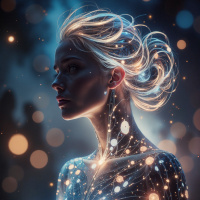advanced machinery. The background is dark, with the focus on her illuminated by particles of light that float around her, giving the image an otherworldly and mystical atmosphere. The color palette is dominated by shades of blue and white, which complement the woman's pale complexion and contribute to the overall ethereal quality of the artwork.