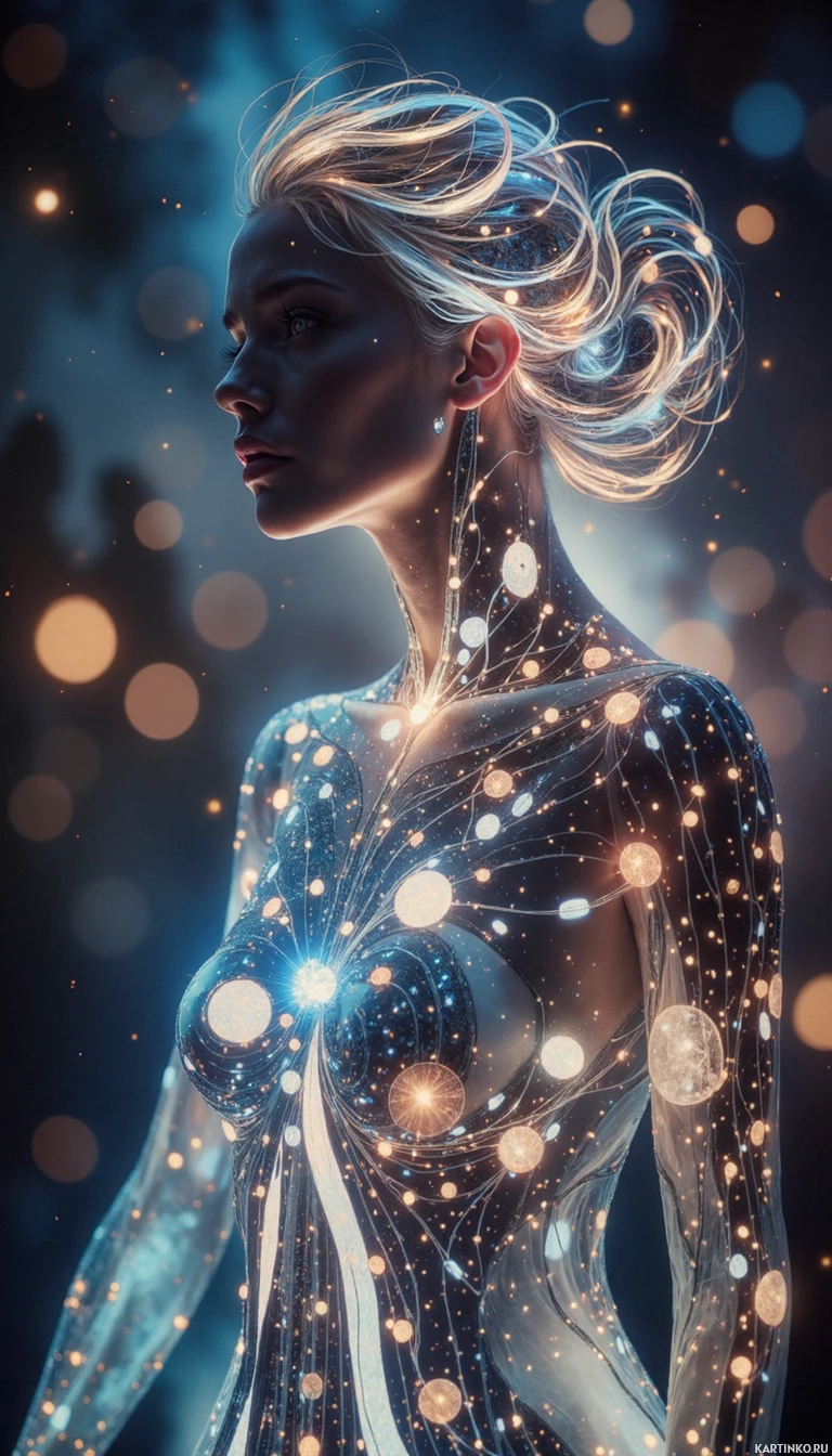 intricate design on her body that resembles a form of digital or technological interface. The design includes what appears to be circuit-like patterns and structures that glow with