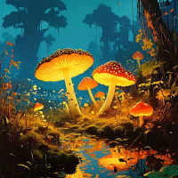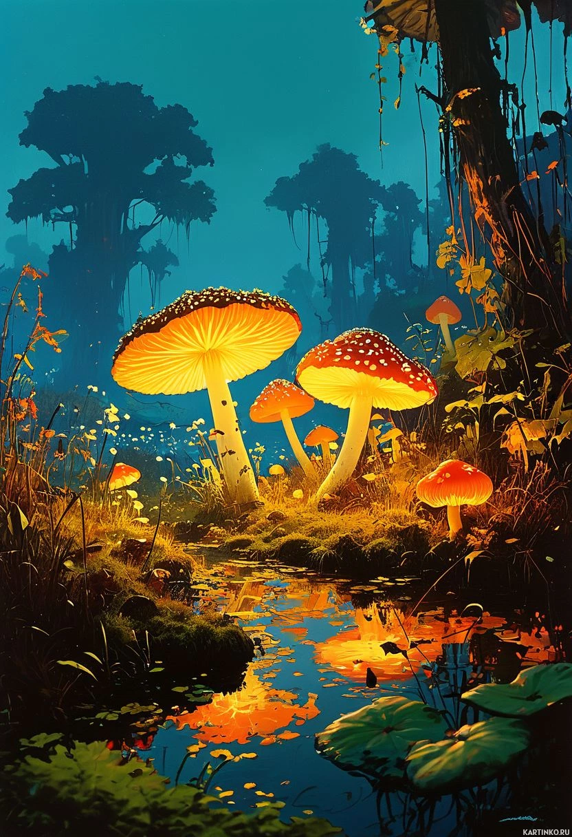 forest scene with several large, vibrant mushrooms. These mushrooms are of