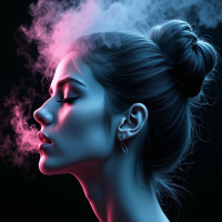 closed eyes and smoke rising from her head. She appears to be in