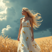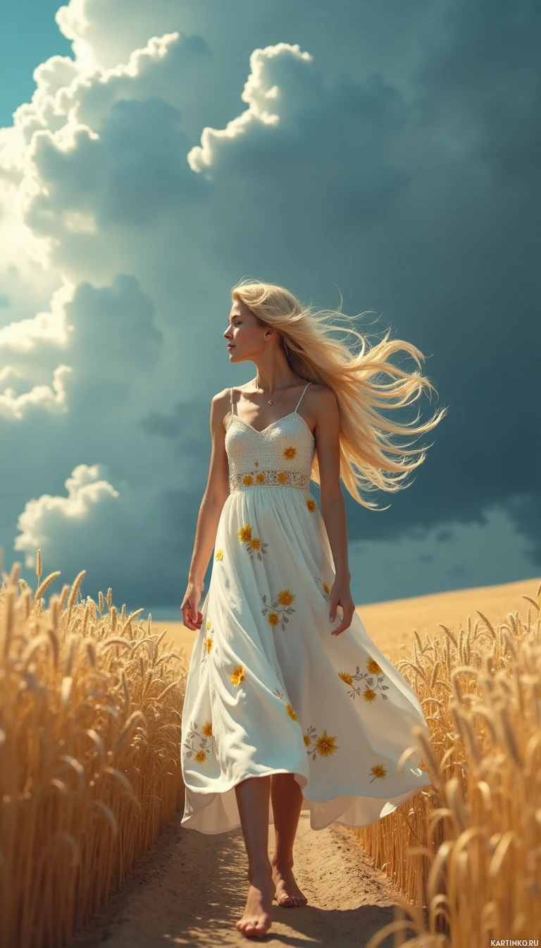 a young woman with blonde hair, walking through what appears to be a wheat field. She is wearing a light-colored dress adorned with yellow flowers and has her hair styled into