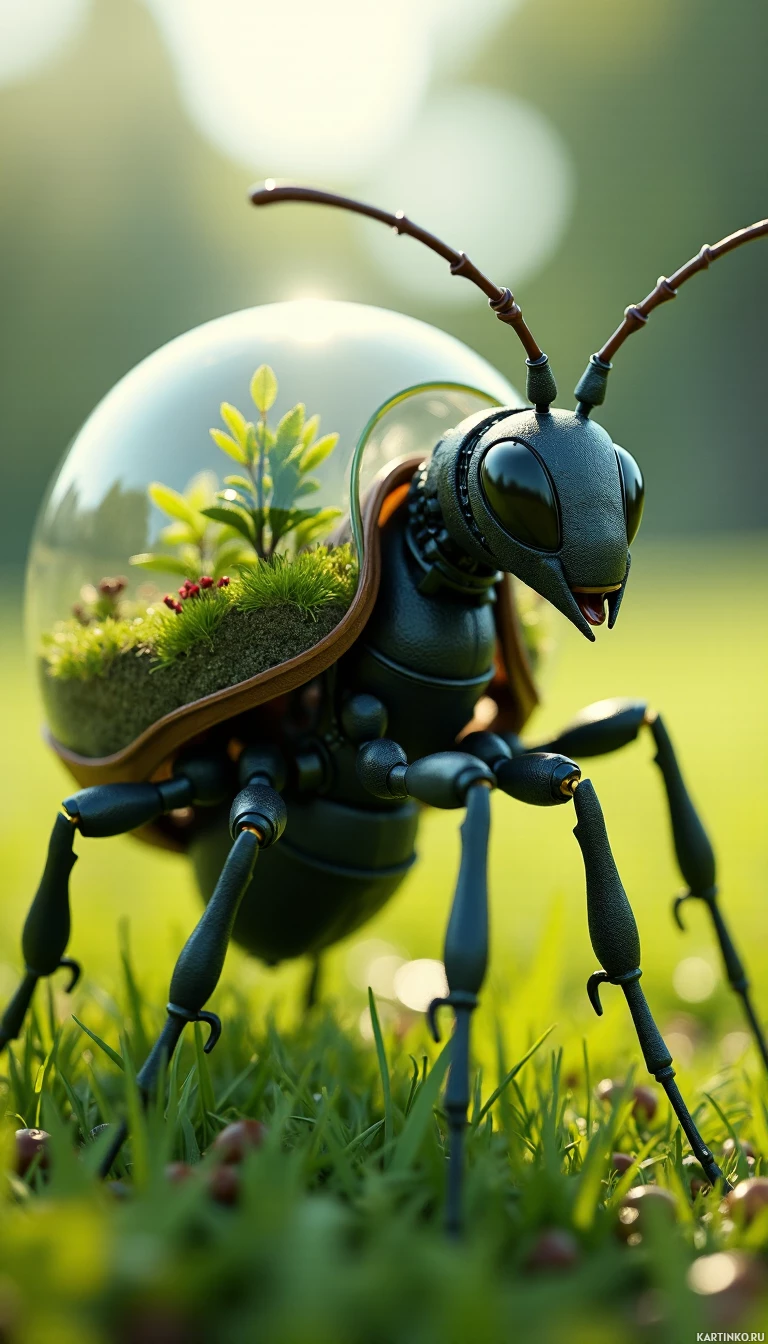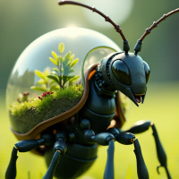 green plant inside a clear dome-like structure that resembles a bubble, giving the impression that the plant is being carried by the ant as if it were an astronaut in space. The background is softly blurred and depicts a natural outdoor environment with trees, indicating that this scene is set in nature rather than in a controlled laboratory or