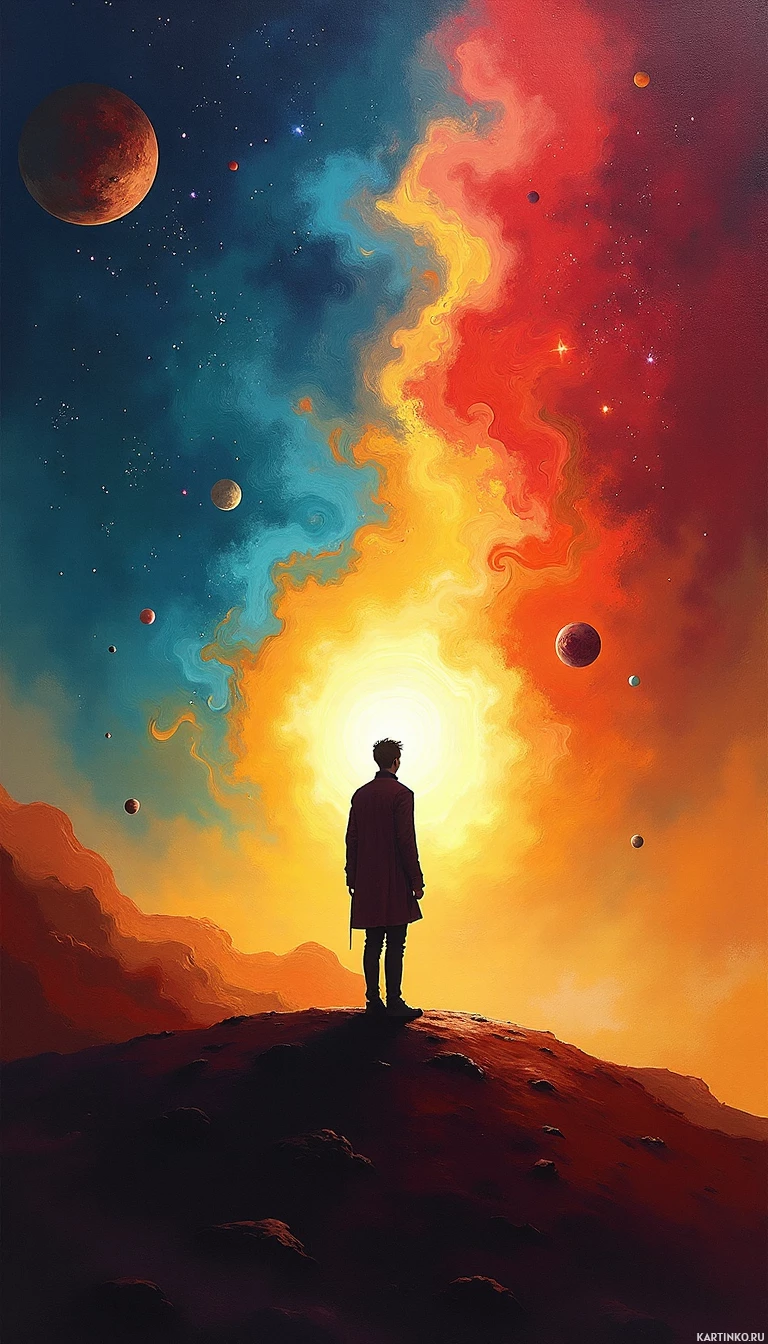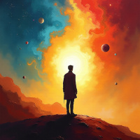 cosmic scene that includes stars, planets, and nebulae, suggesting a deep contemplation of the universe. The person is silhouetted against