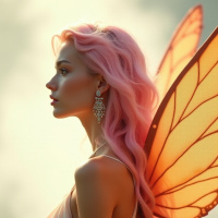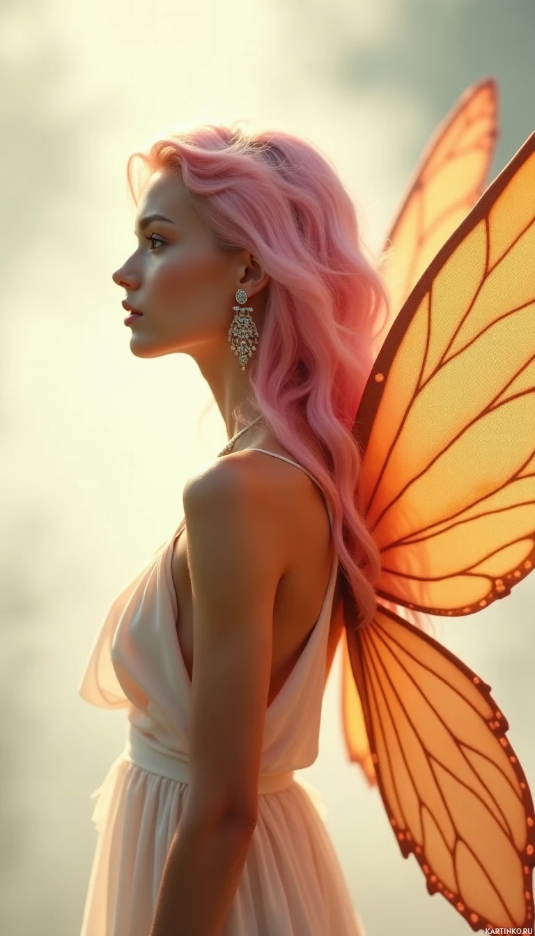 pink hair standing in what appears to be a dreamlike setting, possibly the sky given the soft lighting and hazy atmosphere. She has fairy-like wings attached to her back that are glowing with