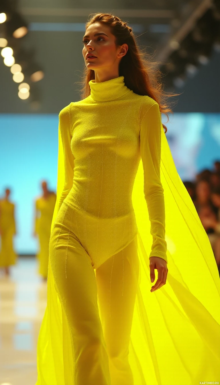 a female model walking on what appears to be a runway during a fashion show. She is wearing a vibrant yellow, high-fashion garment that drapes elegantly around her body, extending down into