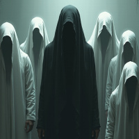 casting shadows that give an impression of a moody or somber atmosphere. The hoods obscure their faces, adding to the enigmatic