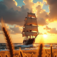 На картинке – живописный закат с парусником на горизонте, частично скрытым высокой травой, силуэт которой выделяется на фоне тёплых оттенков неба. Облака и золотое солнце отбрасывают длинные тени, создавая умиротворённую атмосферу.