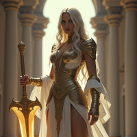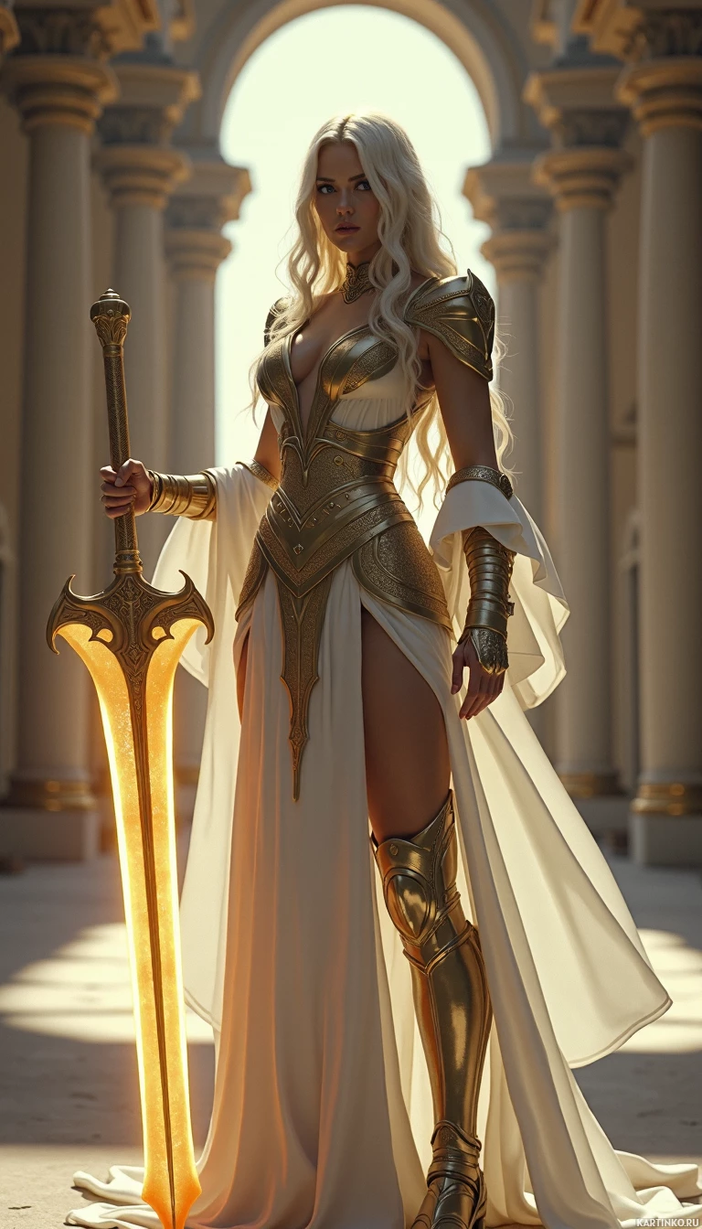 In the image, there is a figure dressed in armor and holding a sword. The armor appears to be of an ancient or mythical design, possibly inspired by historical warriors or