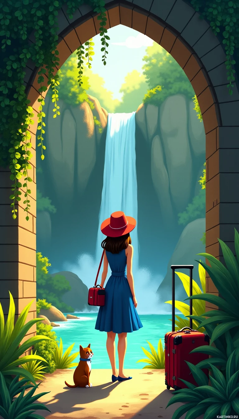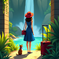 natural setting with lush greenery, including ferns and what appears to be a small waterfall. The color palette is vibrant, with a focus on greens and blues that convey