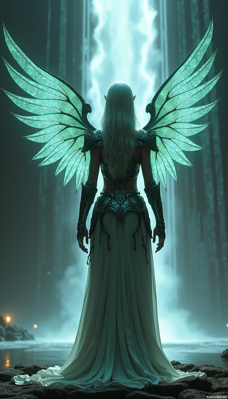 guardian archetype within her narrative context. One of the most striking features is the pair of wings that sprout from her shoulders, resembling those often associated with angels or