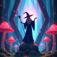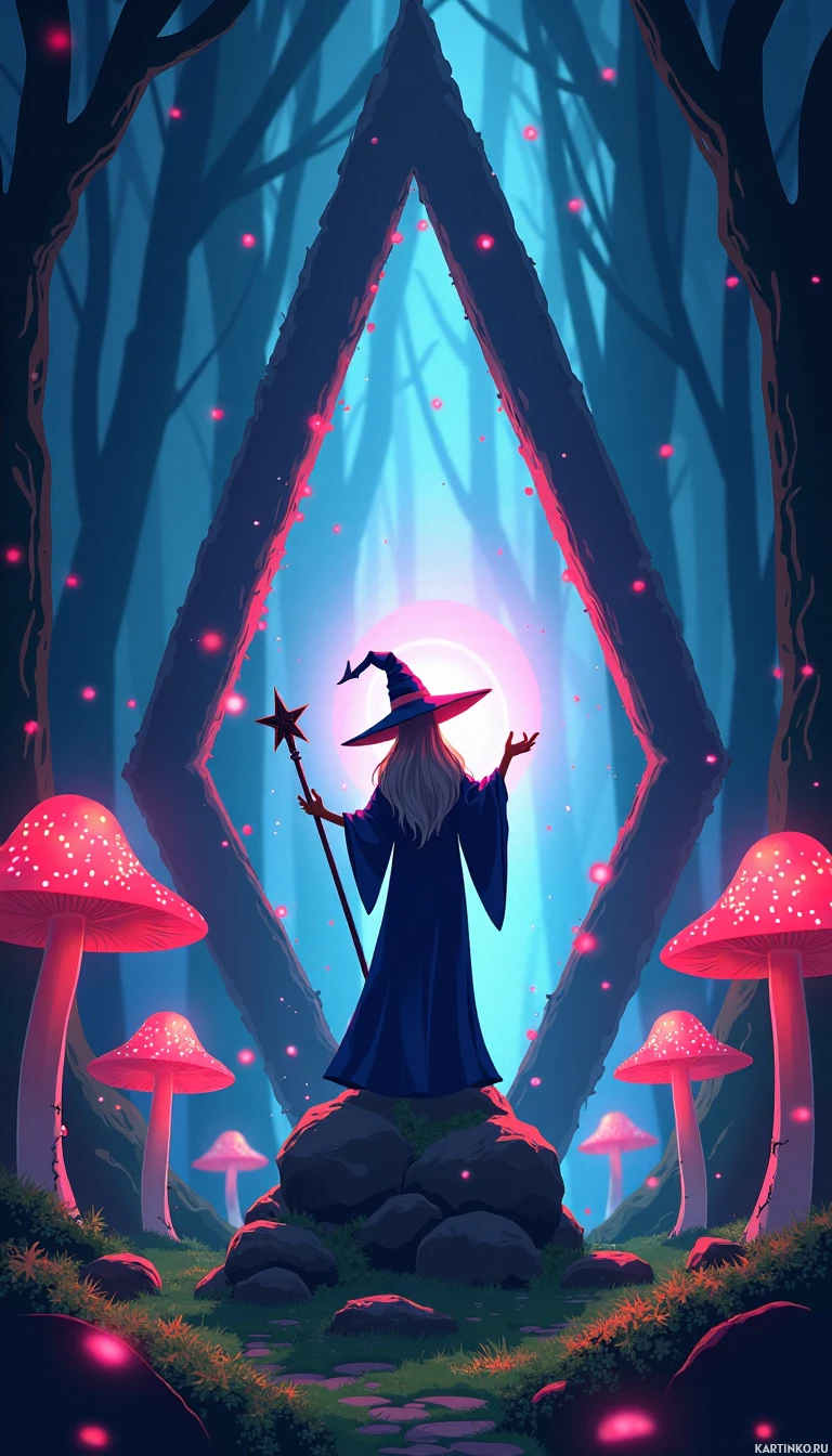 the magical atmosphere of the scene. The forest floor is lush and green, suggesting a well-maintained and healthy environment for the flora present. The color palette of the image is dominated by blues, greens, and pinks, with warm accents from the witch's hat and robe adding a touch of contrast. The overall style of the artwork suggests it could be an illustration related to fantasy literature or games due to its whimsical and enchanting nature.