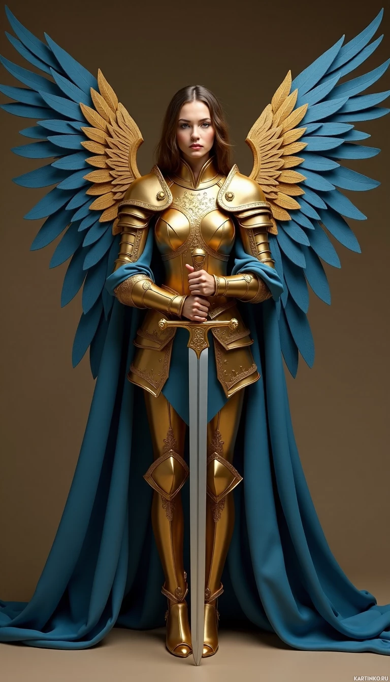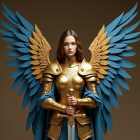 a fantasy warrior. The individual is wearing armor consisting of gold and blue colors, with