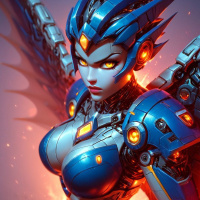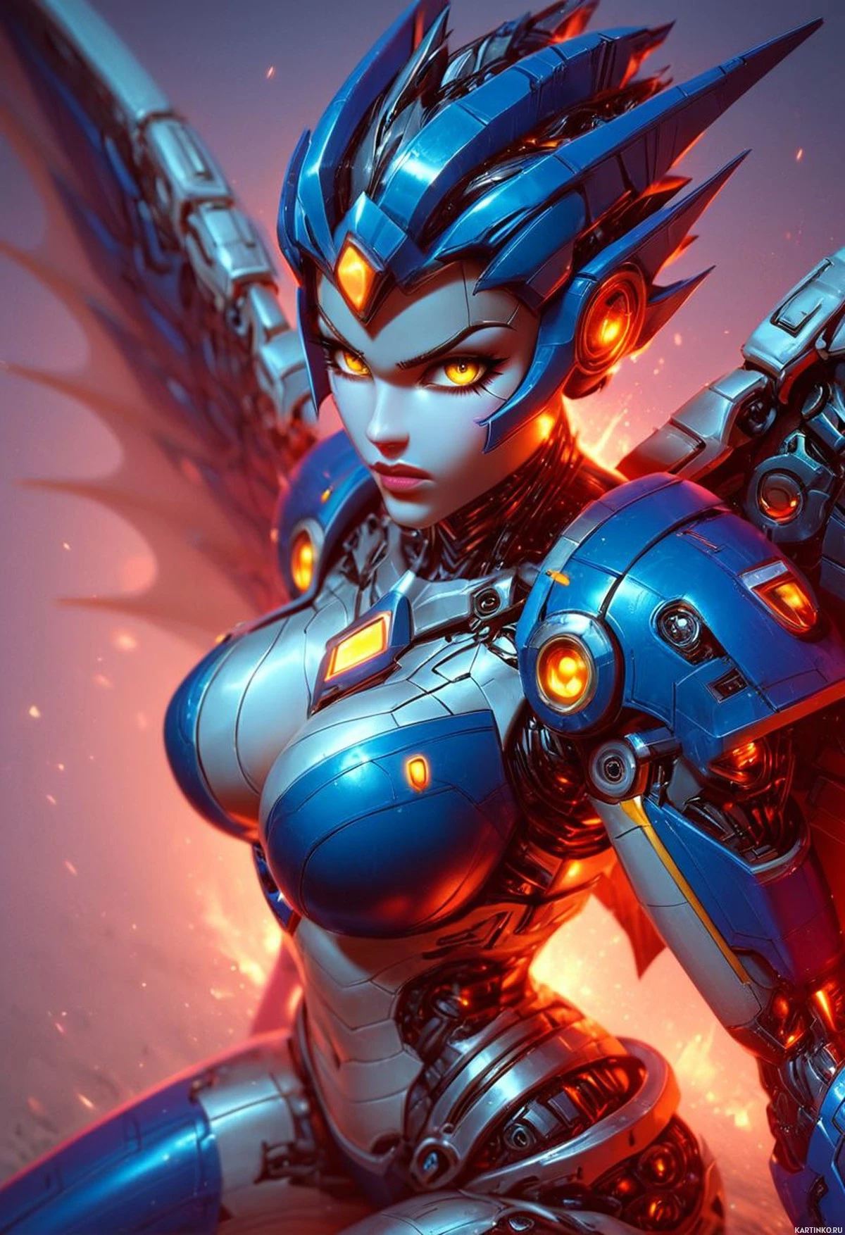 robot character. This character has a combination of organic and mechanical features, with skin that looks soft and human-like, paired with metallic blue armor and cybernetic enhancements such as