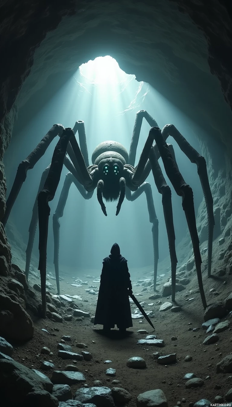 mechanical creature has multiple legs and its body appears to resemble that of a spider, but it is made of metal rather than biological components. The atmosphere suggests