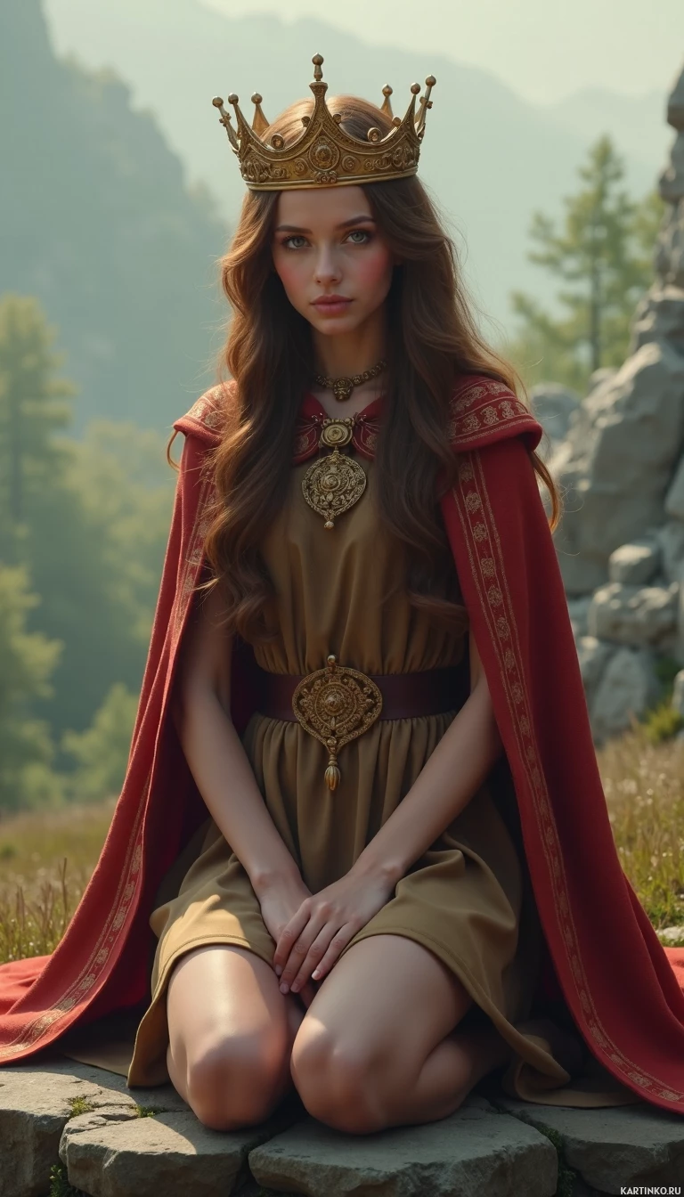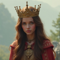 golden crown sits atop her head, giving her the appearance of royalty or nobility from that era. Her hair is styled in