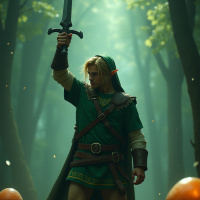 На картинке запечатлен персонаж Линк из игры "Легенда о Зельде". Он изображен в динамичной позе, стоя у входа в лес, где растут мшистые камни и деревья. На персонаже традиционный зеленый и жёлтый костюм, включая шляпу, что намекает на то, что он отправился в поход или приключение. В правой руке он держит меч, что говорит о том, что сражения – часть сюжета этой игры. Общая композиция картинки передает ощущение предвкушения эпического путешествия в фантастическом мире "Легенды о Зельде".