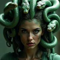 In the image, a woman is depicted with a fantasy-themed outfit and makeup. She has a snake headpiece with two snakes coiled around it, resembling Medusa from