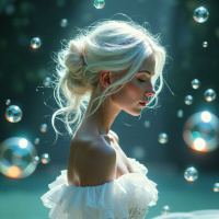 floating bubbles and what seems like mist, giving the scene a dreamy, serene quality. The woman's pose and expression convey