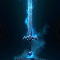 The image shows a sword with a blue glowing effect emanating from its blade. The sword has a metallic sheen and is positioned upright on a surface, which appears to be stone. It's a three-dimensional rendering or graphic artwork rather than an actual photograph.