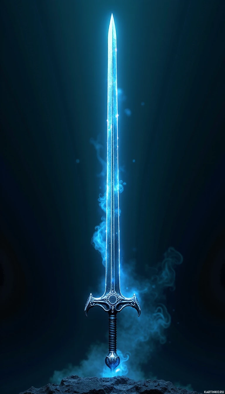На картинке изображён меч с голубым свечением, исходящим от лезвия. Металлическая поверхность меча блестит, он стоит вертикально на каменной поверхности. Это трёхмерная визуализация или графическая работа, а не фотография.
