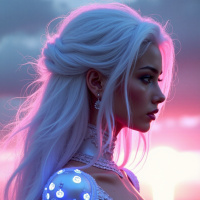 white hair, styled in an updo. They have a long wig and appear to be looking off to the side with