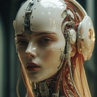 natural beauty. On her forehead and neck, there are visible metal parts and wires, suggesting a fusion of biological and mechanical components, which is characteristic of