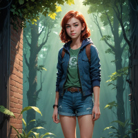 a young woman standing on a brick pathway in what appears to be a forest setting. She has