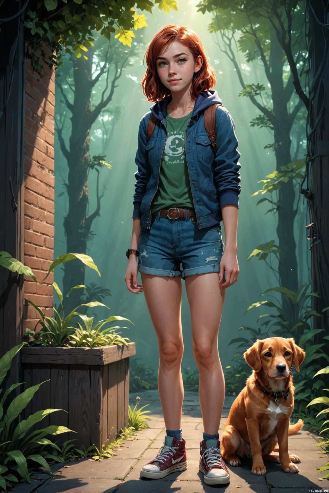 red hair and is wearing a green baseball cap, blue denim jacket, shorts, and tennis shoes. A dog with
