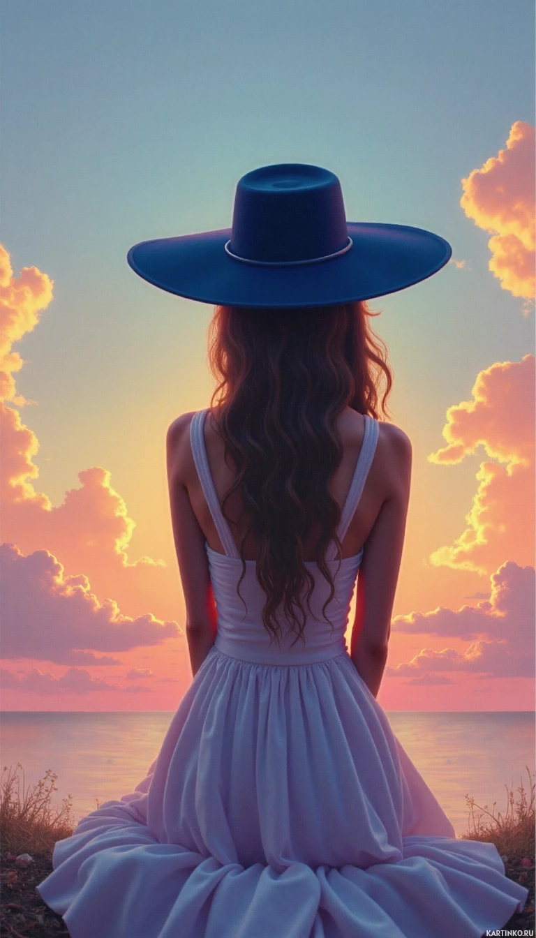 The image features a person sitting on a hillside at sunset. The individual is facing away from the viewer, and their back is visible. They are wearing a dress with a sweetheart neckline and have