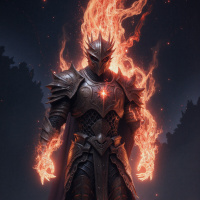intricate designs that might suggest a mythical or magical origin. The flames and the dramatic surroundings give the impression of the warrior commanding fire, a common trope in