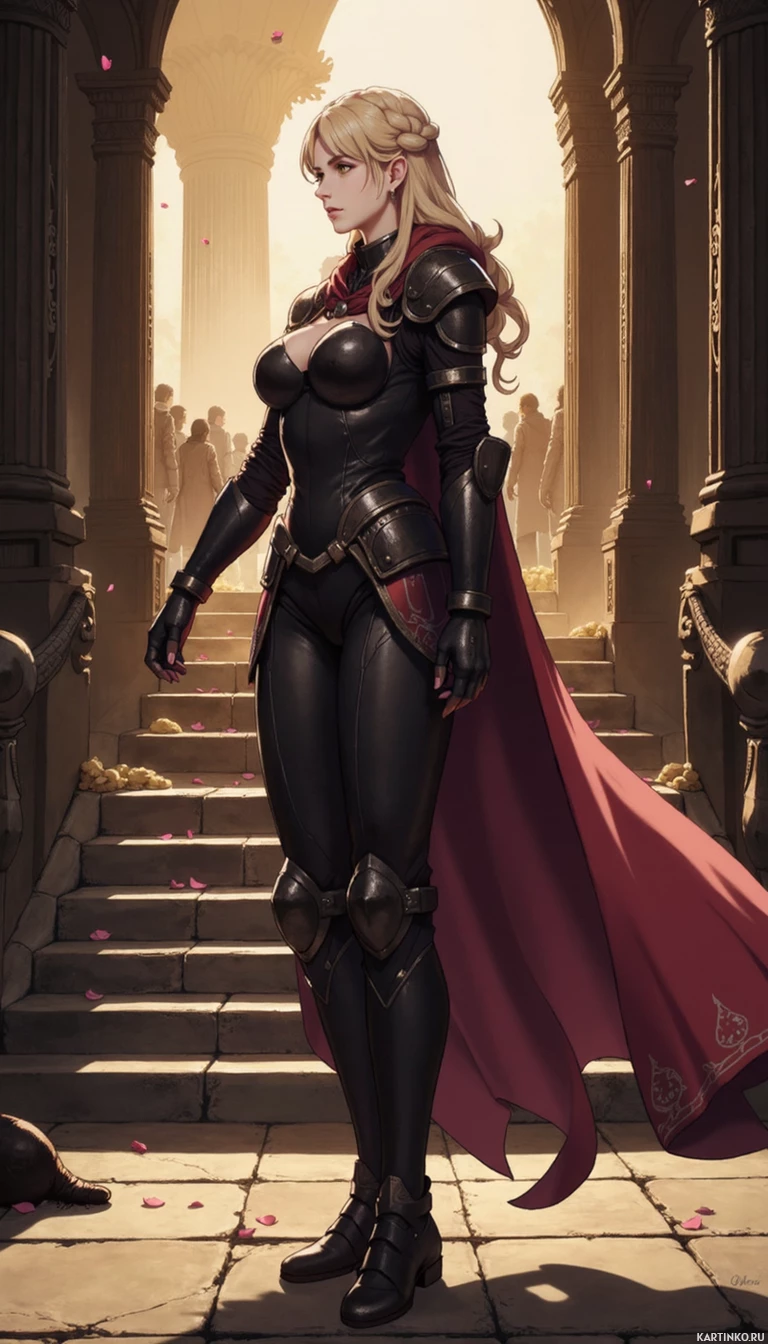 a red cape draped over her shoulders. The setting appears to be an ancient or fantasy-style cityscape with arches and steps leading upward, suggesting a scene from a castle or