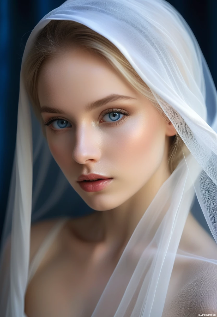 a wedding veil draped over her head, suggesting that she might be portraying a bride. The color of the veil is white, which is a traditional color for bridal veils. The background behind her is dark blue, providing a contrast that highlights her features. The overall style of the image suggests it could be from a professional photoshoot, possibly for fashion or wedding-related purposes, given the attire and setting.