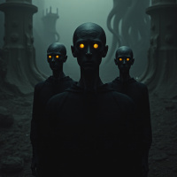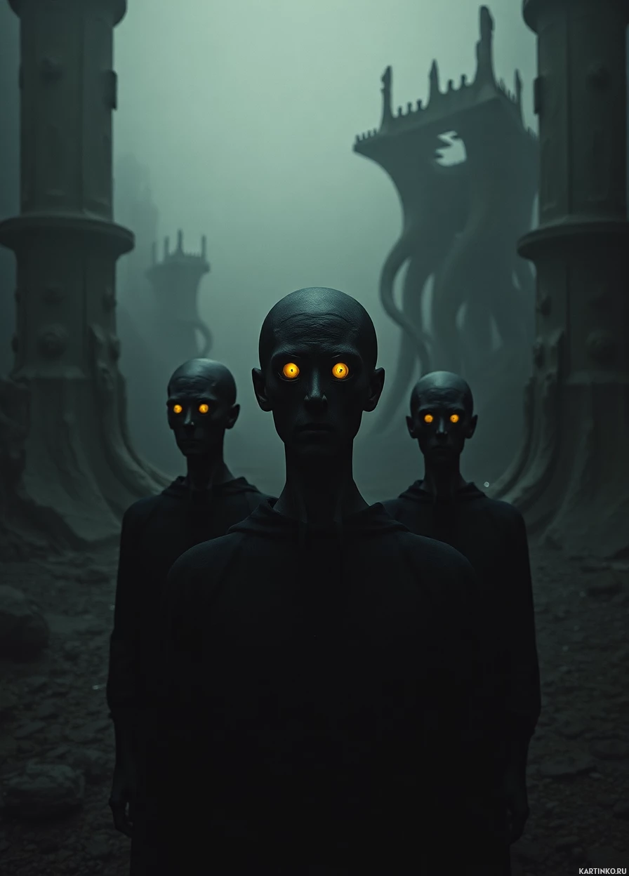 yellow eyes, which adds an eerie and supernatural element to their appearance. The background features ruins with pipes and structures that are partially submerged in water, contributing to