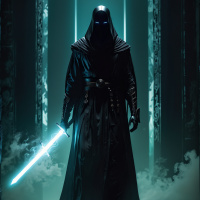 The image depicts a character dressed in dark