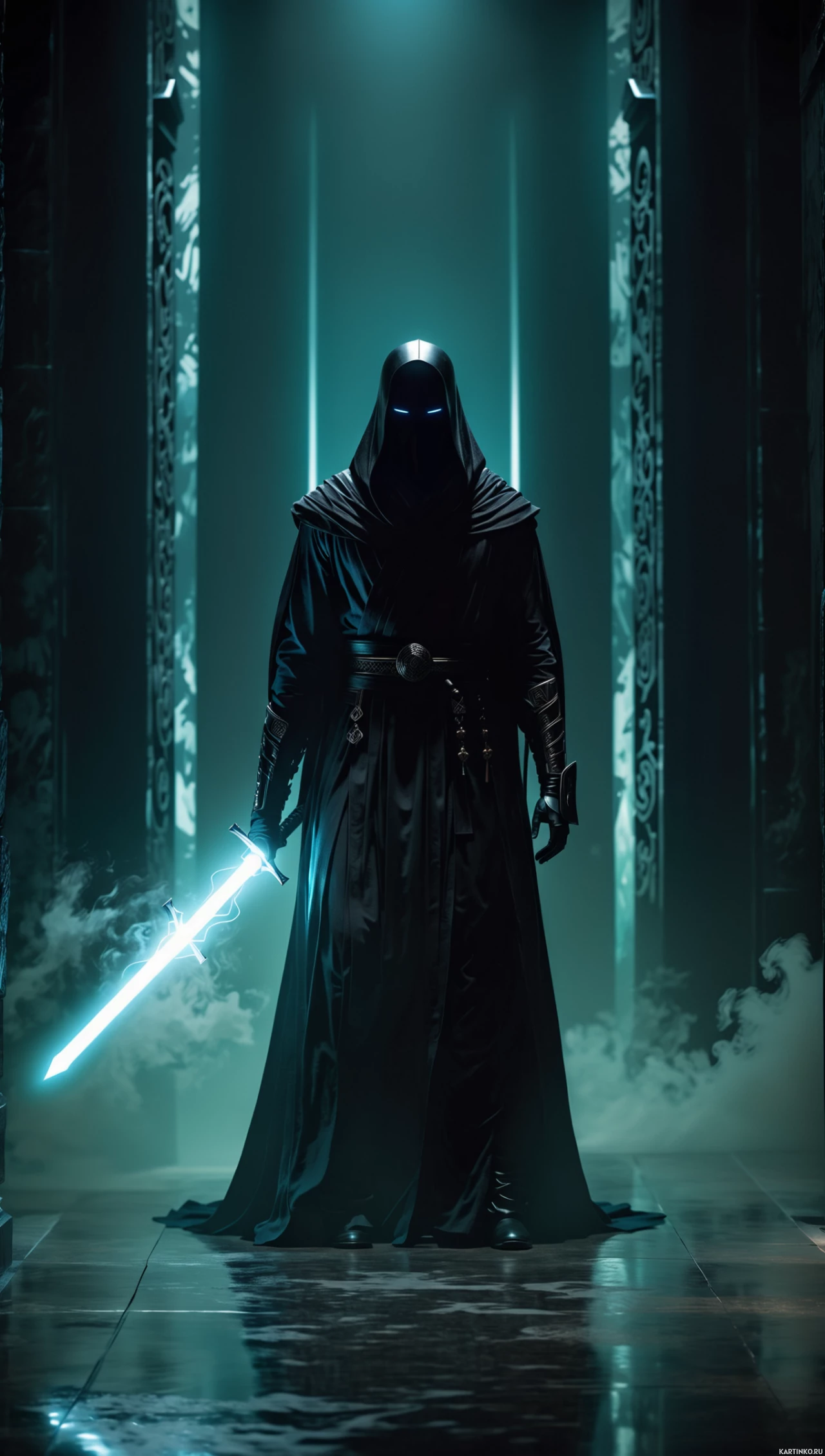 fantasy attire, including a hood that obscures their face. They are holding a sword and standing within what appears to be a dungeon or fortress setting with