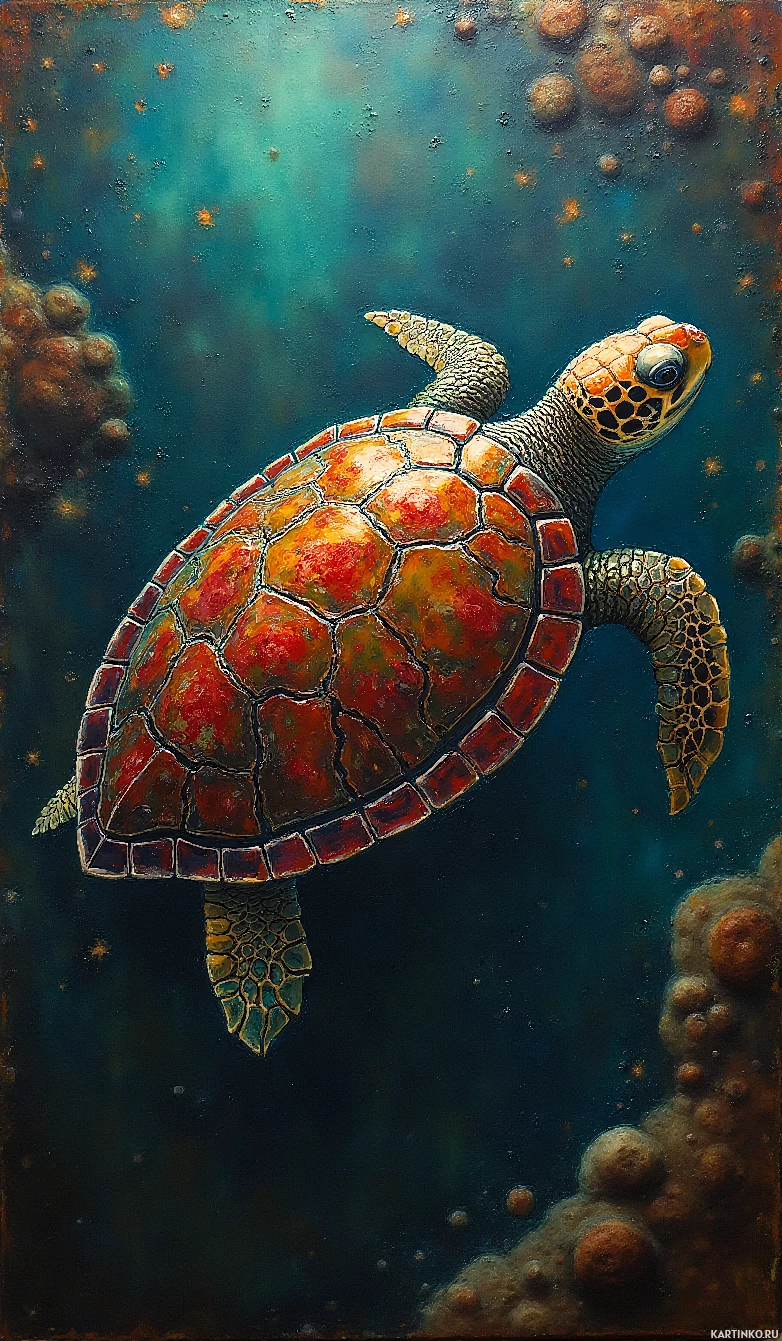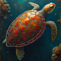 sea turtle, characterized by its hard shell adorned with hues of red and yellow. The background presents an underwater scene with blue water and bubbles, suggesting movement or perhaps the presence of another