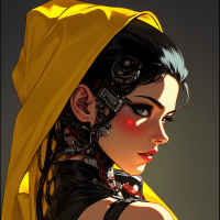 a female character who appears to be from a science fiction setting. She has dark hair and is wearing futuristic-looking clothing that seems to blend human and mechanical elements, such as wires and panels on her shoulders, which suggests she may have