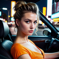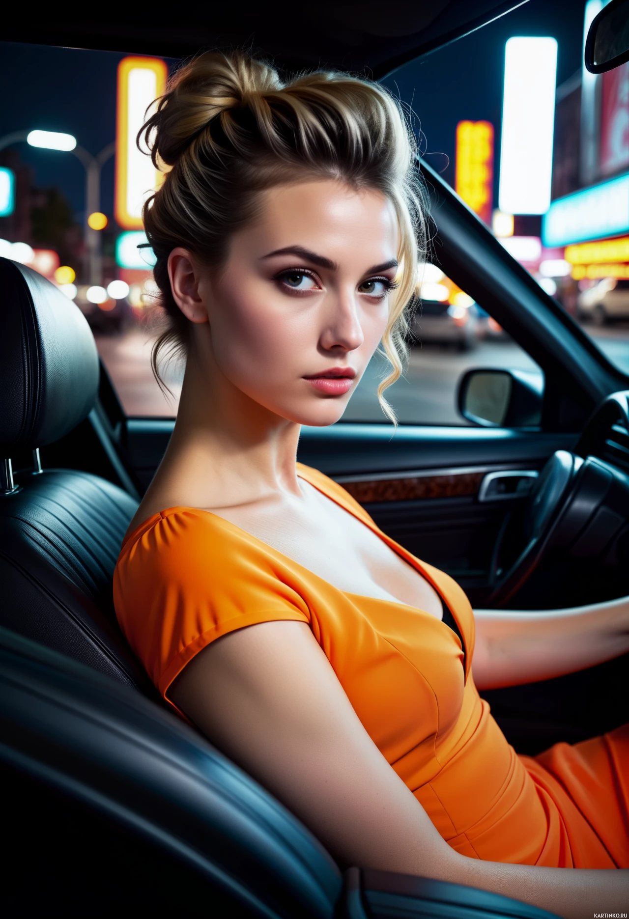 an orange dress and has her hair styled in a high bun. Her expression appears serious or contemplative, as she looks directly at the camera. The interior of the car is illuminated by