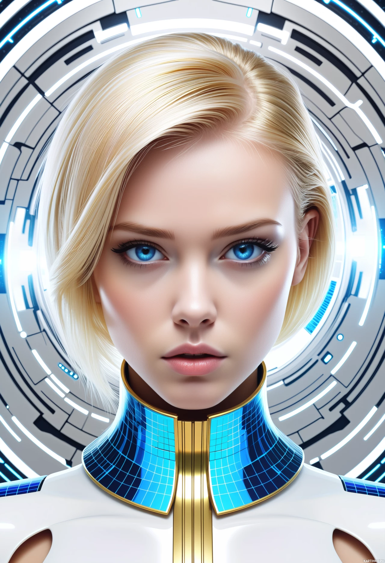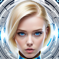 a science fiction context. Her makeup is done elegantly, enhancing her features, and she has visible eyelashes that stand out prominently. The lighting in the image highlights her face clearly against a backdrop of high-tech imagery, which includes circuitry and other technological elements indicative of