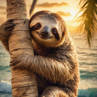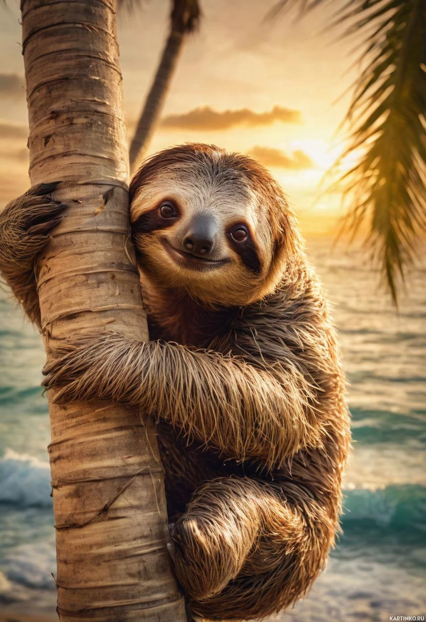 a palm tree. The sloth has its eyes closed and is smiling, giving
