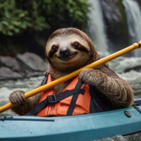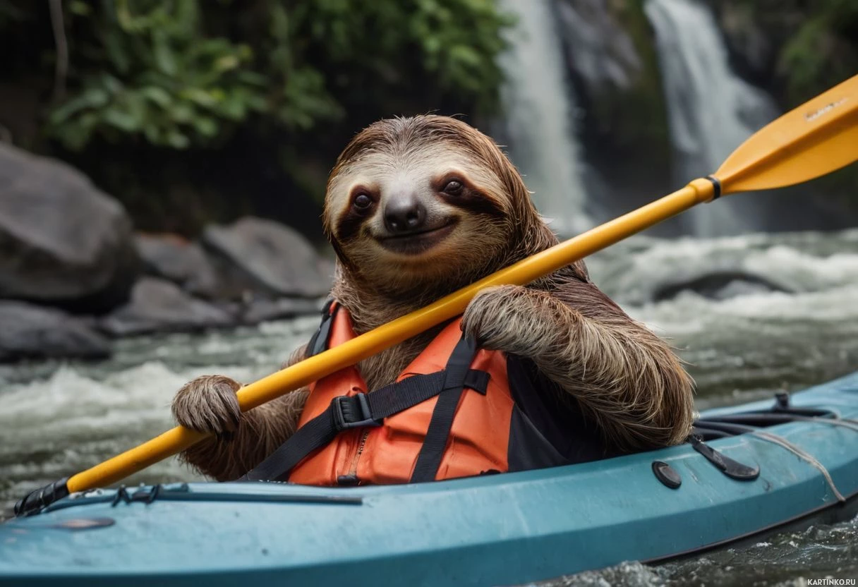 The image features a sloth sitting in the front of an inflatable kayak. The sloth is smiling and holding onto yellow oars, suggesting it is paddling or ready to paddle the boat. In the background, there's a river flowing towards a small waterfall, indicating that the setting might be