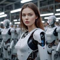 protective gear, possibly related to the work environment she's in. Her presence among the robots and her attire suggest a connection between human workers and